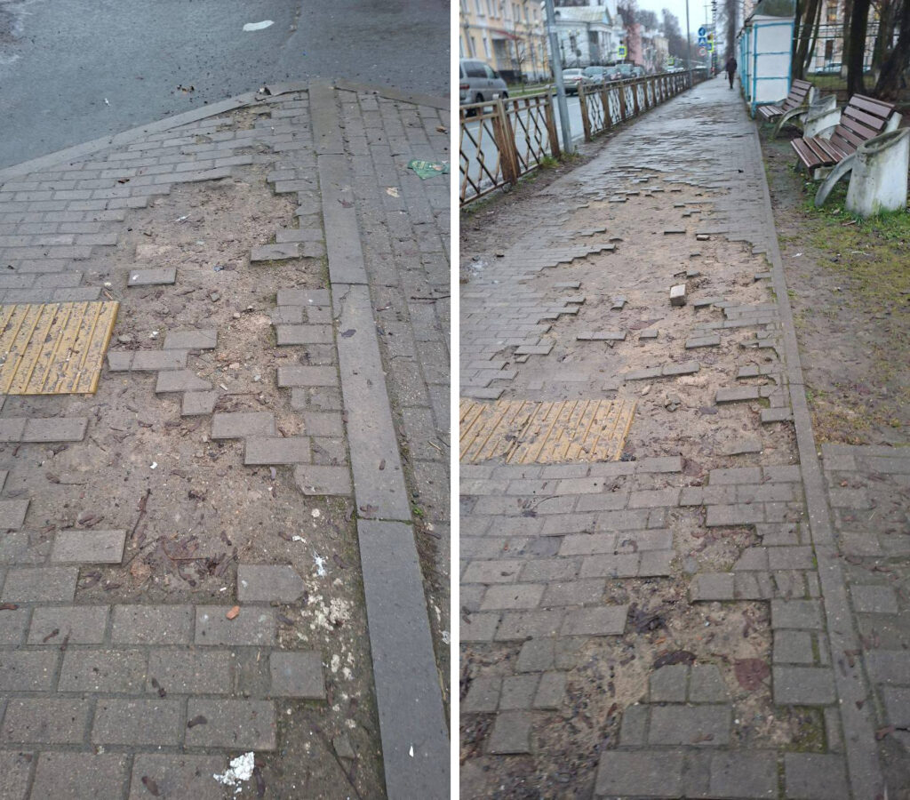 Вот так сейчас выглядит тротуар на улице Калинина — участок от Детской до Георгиевской, вдоль бассейна. Плитка там словно после бомбёжки: половина тротуара в ямах, люди постоянно спотыкаются. И это в самом центре города! Здесь ходят и туристы, и псковичи. Представьте, насколько неудобно там пожилым людям, людям с инвалидностью или родителям с колясками. Плюс ржавый забор и осыпающийся фасад вокруг — место выглядит совсем не так, как должно выглядеть городское пространство в сердце Пскова.